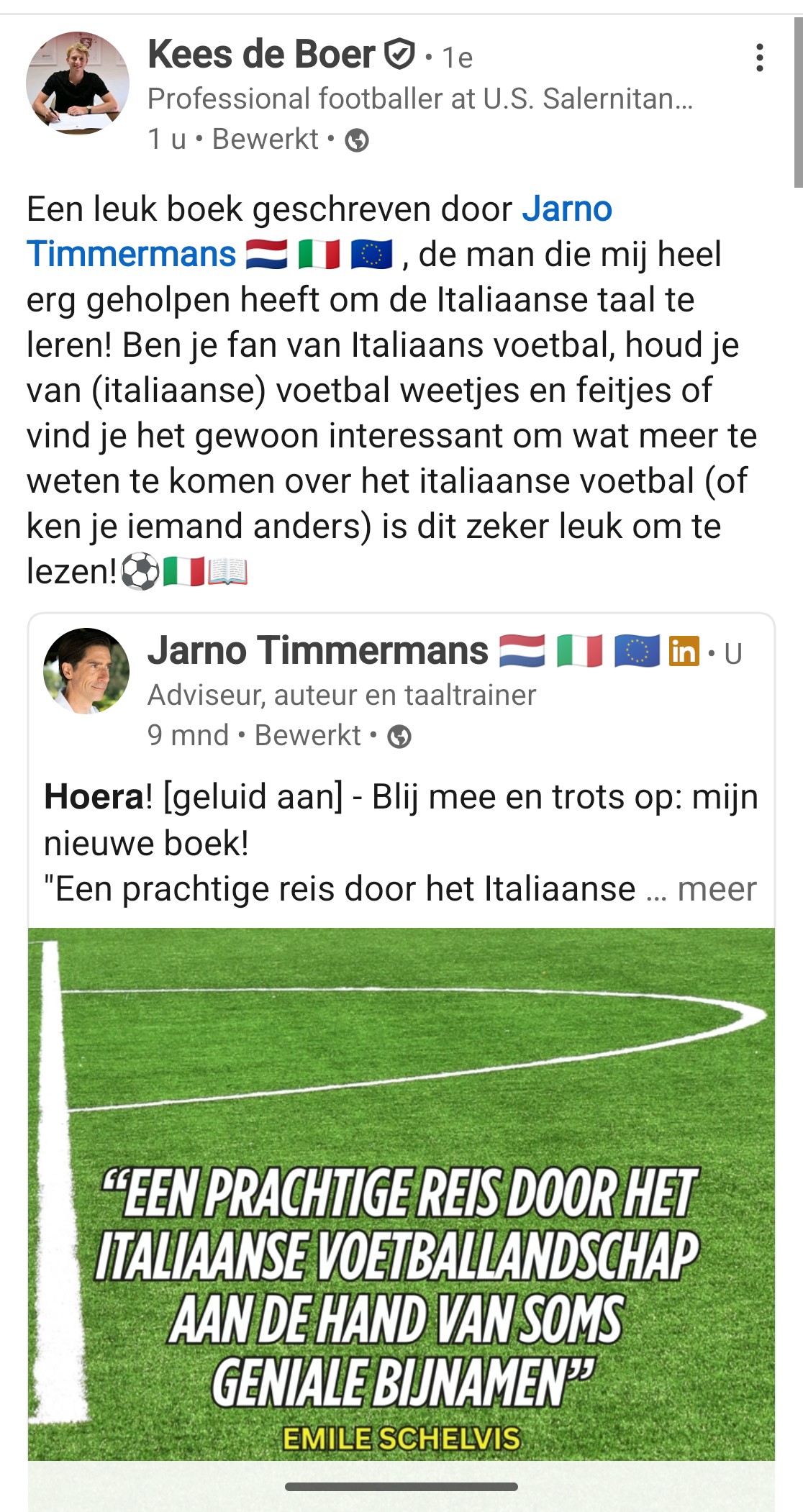 Kees de Boer, profvoetballer bij Salernitana: Een leuk boek geschreven door Jarno Timmermans, de man die mij heel erg geholpen heeft om de Italiaanse taal te leren! Ben je fan van Italiaans voetbal, houd je van (Italiaanse) voetbal weetjes en feitjes of vind je het gewoon interessant om wat meer te weten te komen over...